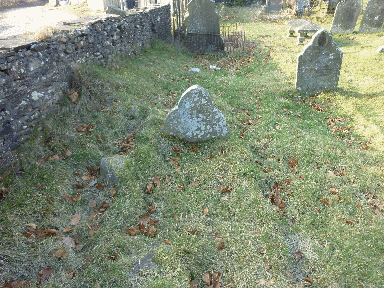 | The gravestone of David Barry at St Illtyd's in Aberbeeg. The grave lies against the stone wall at the front of the church. At the top of the picture is a gate, although it is hard to see it in this photo. On entering through the gate, the grave is the second grave on the right. | |